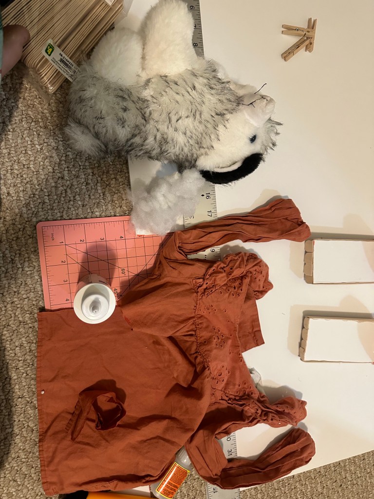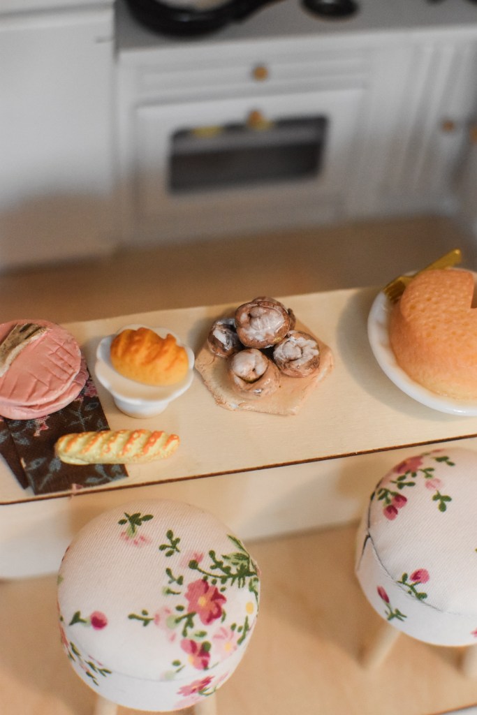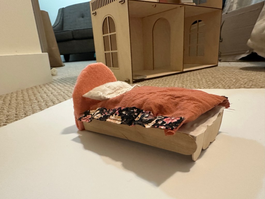 I created the inside using as much recycled materials as I could! It’s amazing how you begin to look at things differently when you’re creating miniatures out of trash! Old clothes were the fabrics I used throughout the house, on old stuffed animal became the stuffing for pillows and things, an empty soother container became the bathtub and un used kitchen sponges became the form of the couch.