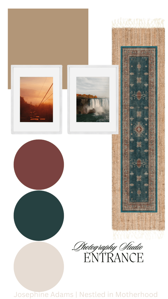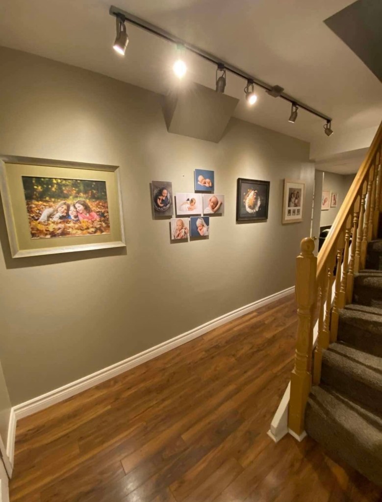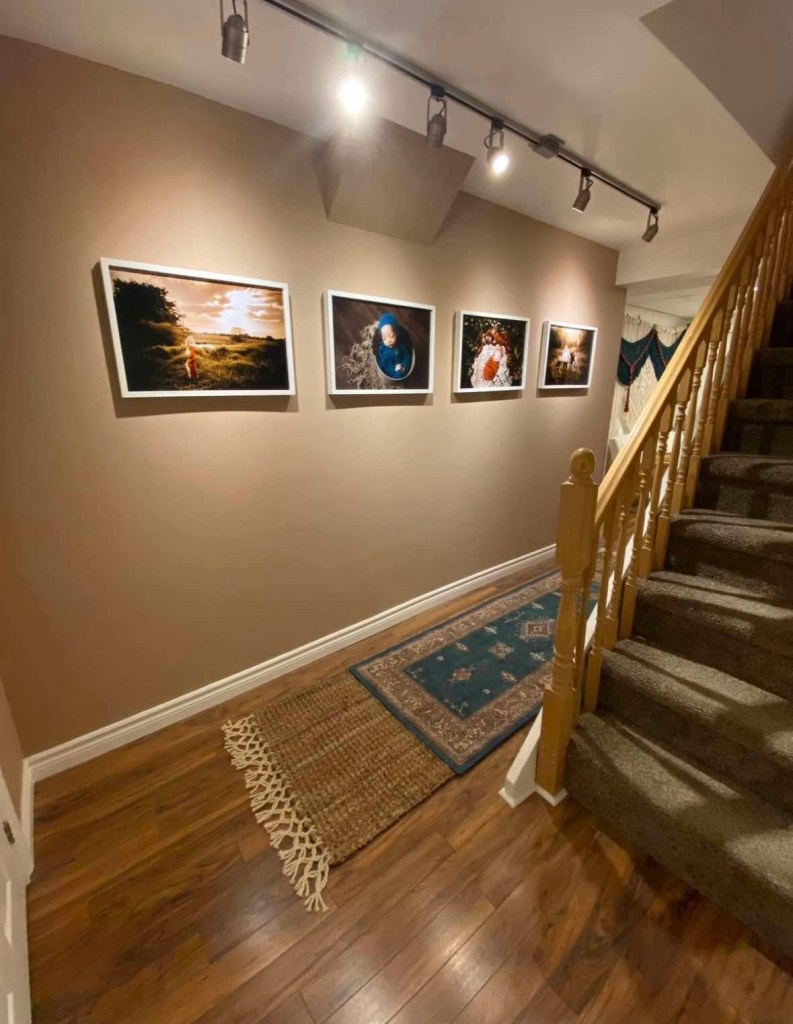 Next plan was the hallway that leads to her studio. A simple wall colour change to something warmer and layering carpet runners would make a huge change! We swapped the frames for a simpler, more cohesive look.