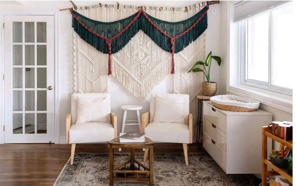 Painting the space white and layering it with neutrals will give it a soothing feel. I KNEW that this space would look incredible with a custom macrame piece and I knew just the artist to create it! My long time friend, Natalie has been an owner of a macrame business and creator of all beautiful things! Natalie incorporated Tara’s business colours and still kept the space neutral. This piece was definitely a wow statement in the making!