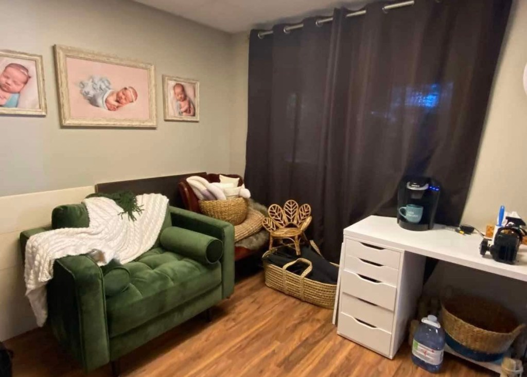 Tara, an incredible family photographer, wanted to elevate her photography space. She wanted a peaceful place for parents, babies and children to enjoy while getting their photos taken. Often parents or big siblings have to hang out a little while Tara snaps a few of the newborn baby. While they wait, she wanted a space for them to sit and enjoy a bevy and snack.