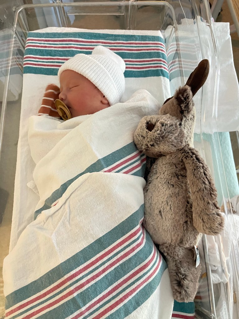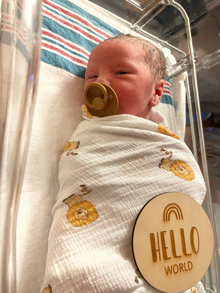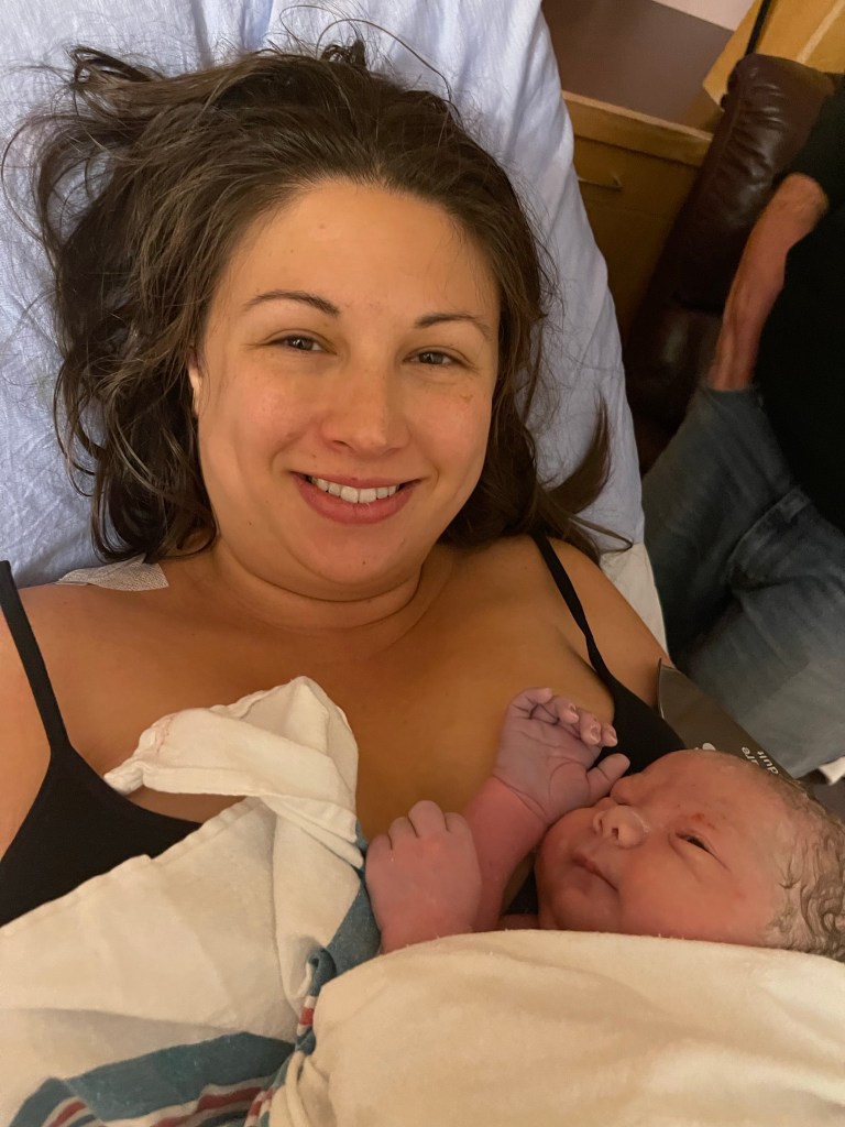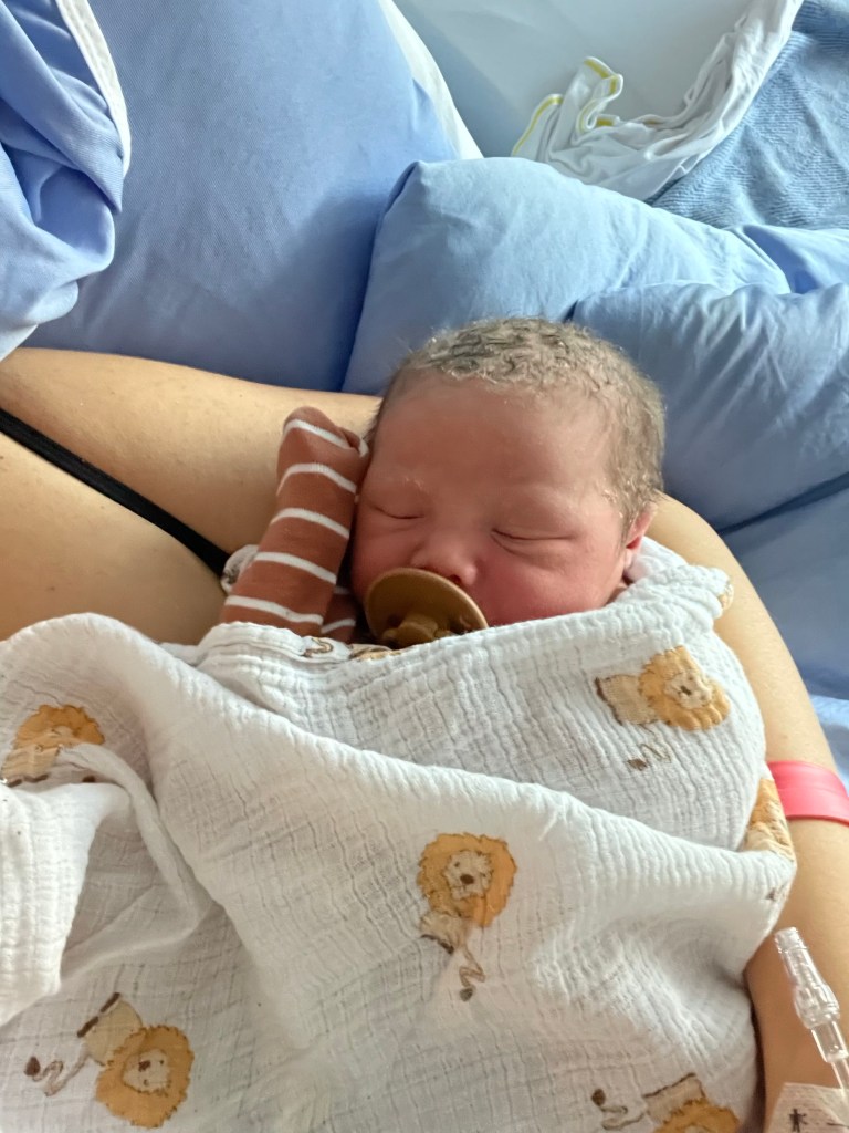 Within minutes I felt relief. I was dilated to 10cm and they checked baby’s head. The midwife student said she felt his head stuck under my pelvic bone. The other midwife confirmed this was likely the reason I was in so much pain. My body trying to push him out, but him getting stuck. With the epidural I was able to relax while the midwife did her thing- guiding his head between every push. Nick knew the drill- with every epidural, laying flat on your back to push the baby out, is hard to do without some help. He lifted one side of my leg and the nurse lifted the other, as if it was a squat position, but while on my back. A few big pushes later while the midwife guided his head out from my pelvic bone and this absolutely BEAUTIFUL boy was out into the world. He layed on my chest with his hands by his head. Not a peep. No cries. The midwives rubbed him up and down and his colour changed. I asked if he was okay? His older sister Larkin was the same and came out perfectly content and quiet. They took him to make sure, cleared his airways and finally he let out a little, wee cry. I layed there thankful and relieved, crying and shaking.