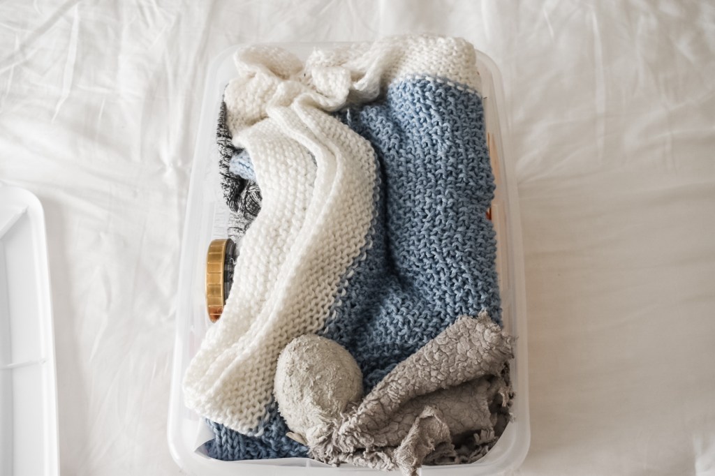 The next task was to put items in piles and organize what goes in and what gets trashed. After completed, I got my new bins and added a coordinating label to each bin. That way it’s easy to recognize from a top shelf once stored.