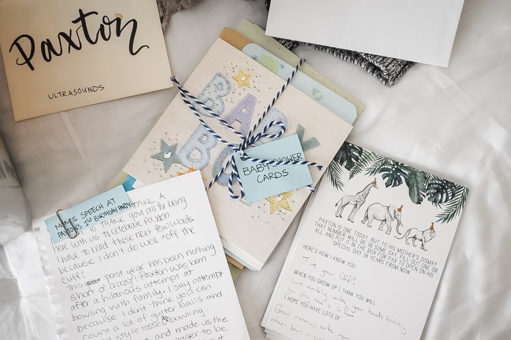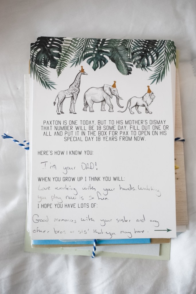 -filled out questionnaires from family members for baby to read when they’re older and open the box (or turn 18)