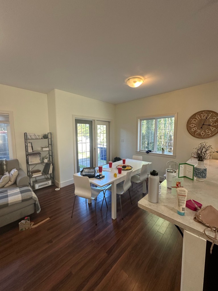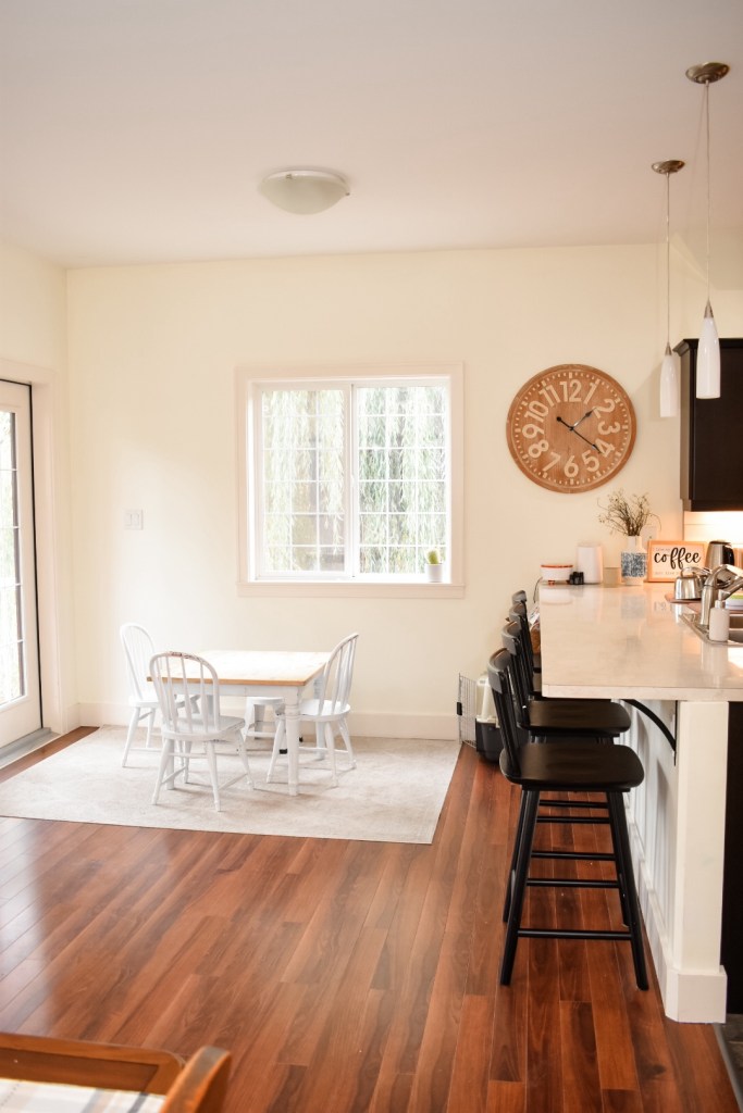 We used the space in the kitchen for lounging, tv viewing and dining. It was a lot to pack into a space, but it worked for our family. The front room was a play area with a couch (no television). As our family gets older and our love for our community grows, we realized our eating area just wasn’t big enough. If we had company over, we would do buffet style, but that meant squeezing between the table and the kitchen counter to get your food. Having a couch so close to the eating area was like a magnet to sticky, icky hands!