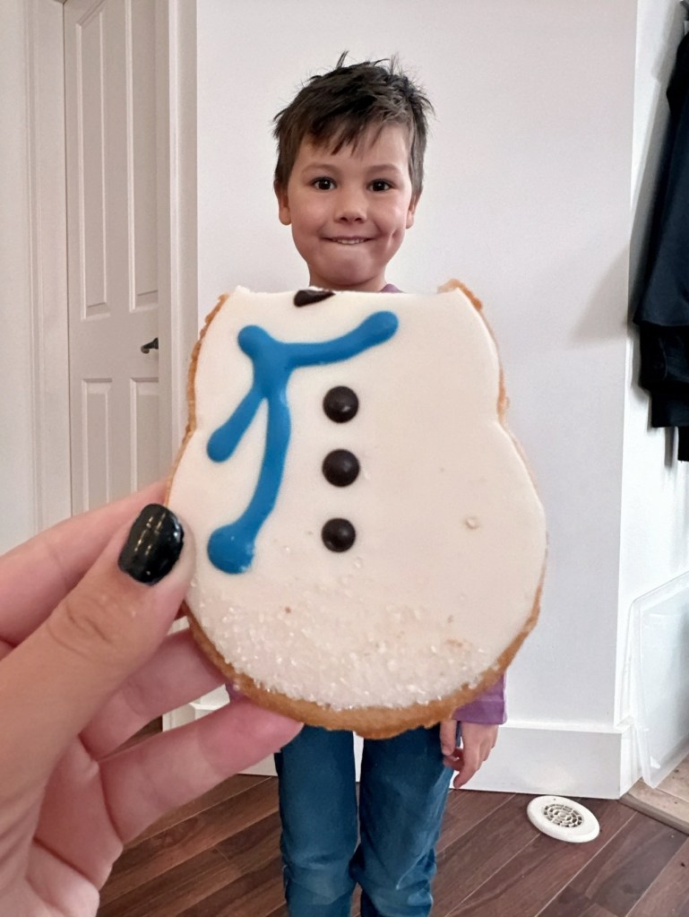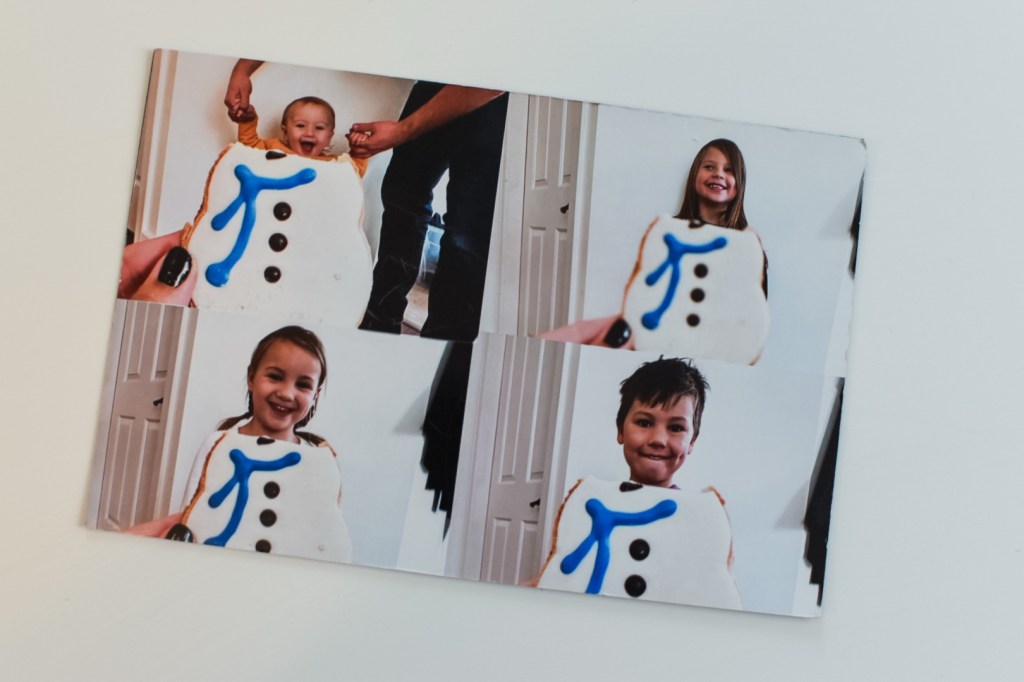 It begins with a trip to our local Starbucks to pick up their seasonal Snowman sugar cookie! Once we get home, we have our kids take individual pictures.