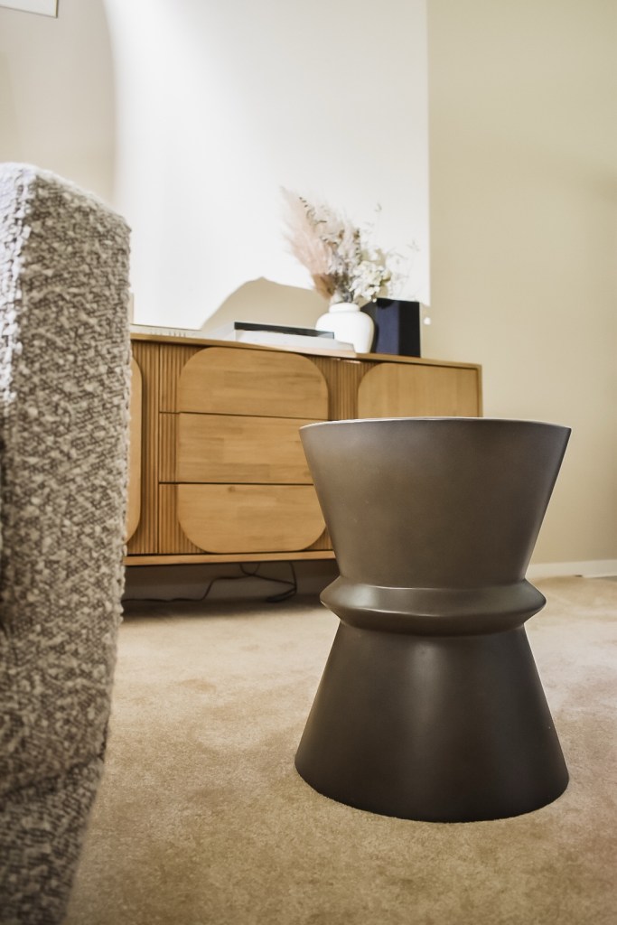 The only other thing we’d like to add to the space in time is an oversized earn planter with a fake indoor plant to the right side of our room, opposite the stove.