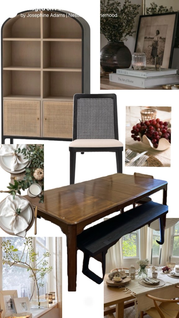 We have some dreams of extending this look into our dining room and kitchen. We like mixing old with new, so I’m happy to keep my dining table and benches and just adding a few things to bring the look together. Here’s the vision for these two spaces:
