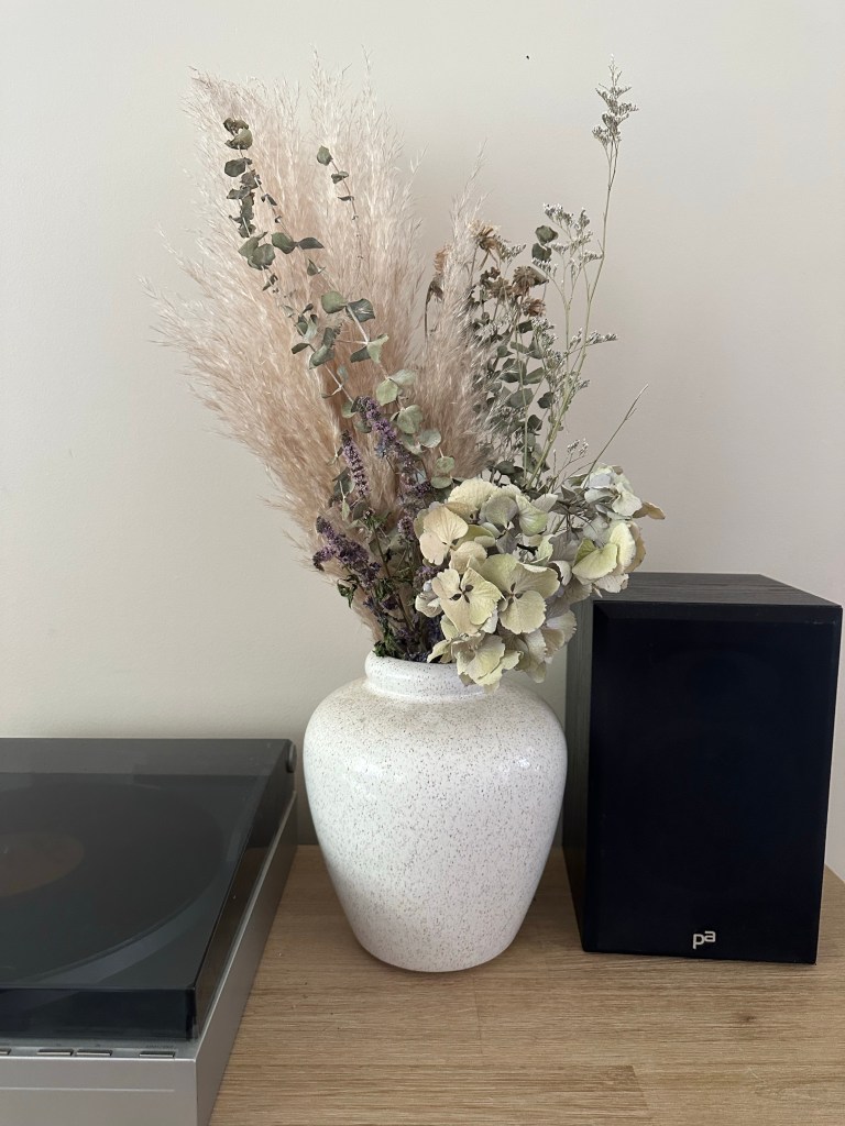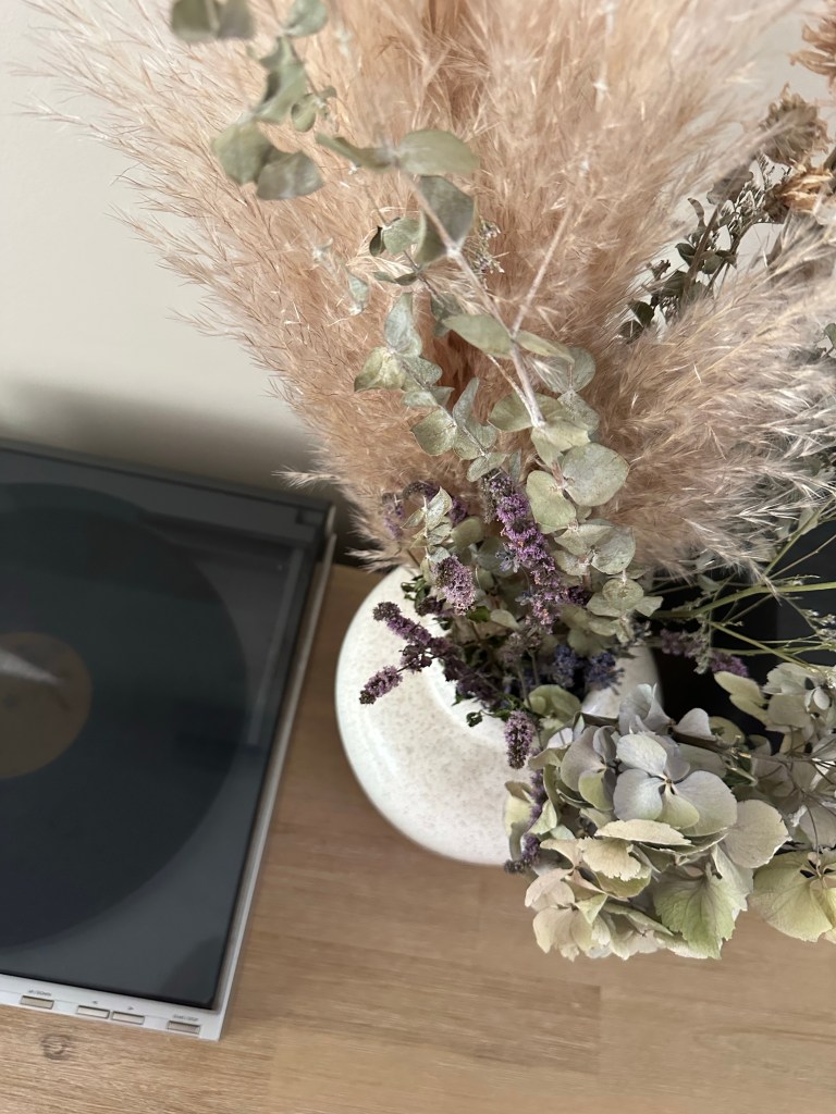 The accessories are simple with a few thrifted finds. A bouquet of flowers given to me last year on my birthday by a friend that I dried and saved, now sits on top of the sideboard.